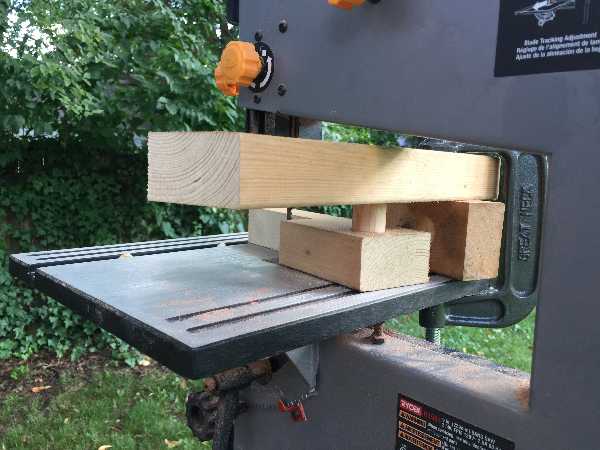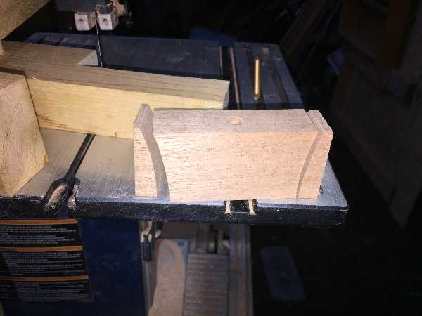 To make this curve I set up a more complex jig. To cut the curve I shoved the block in the corner of the block holder. Only the top of the block was visible to the right of the band saw blade here. The block holder pivoted on a 1" vertical dowel. The dowel is secured to the band saw table with a 2/4 held down with a C clamp.