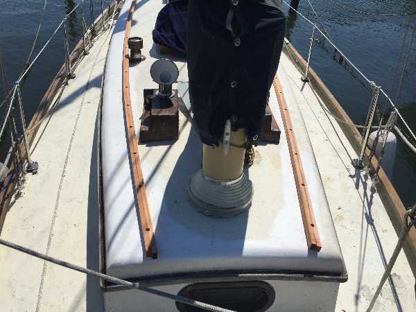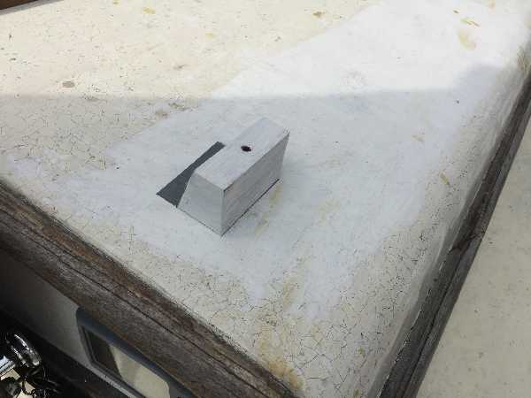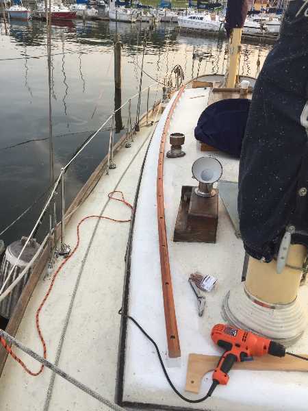 I worked from aft to forward. I used the template to establish the position of the handrail. I then placed the block under the hole. I inserted the bit to center it and square it with the cabin top. If I had trouble getting the bit all the way in I ran the drill in reverse. This helped the bit to bottom out without cutting the sides of the hole bigger than planned. Next I drilled a hole all the way through. I inserted a 3 1/2" bronze screw to hold the block. Then I moved to the next one.