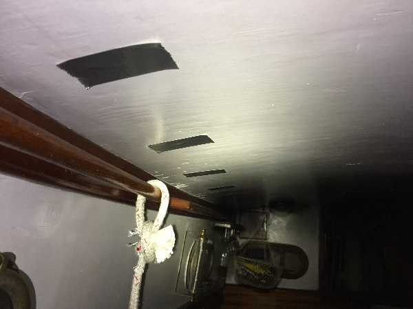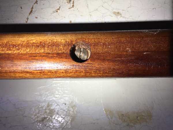 After the epoxy cured I removed the screws. This proved more difficult than I anticipated. I had to buy a propane torch and a large screw driver. I played the lit torch on the screw for about 5 seconds. Then I waited for about 10 seconds. Then I was able to extract the screw without damaging it. I removed the tape and sanded the burrs smooth. Then I applied a coat of finish paint. Just these steps took the better part of a day's visit to the boat.