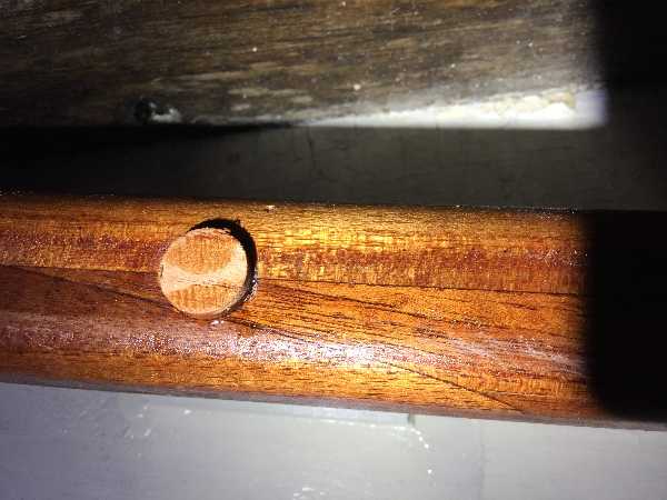 I put a bung in here and secured it with Gorilla Glue. After it dried I carefully cut the top of the bung off approximately flush with a Japanese hand saw. I used heavy grit sandpaper to smooth it flush. Then I applied a coat of varnish to seal it up.