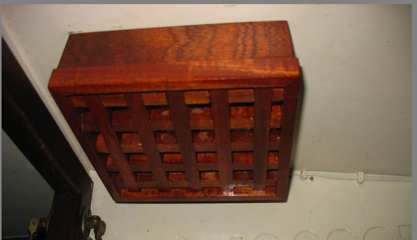 Finally I devised a way to mount the cover on the overhead so that it was easy to snap off but would stay secure. I ran a wire up from aft and it was good to go. Below is the finished vent. ![]() | |