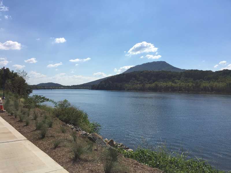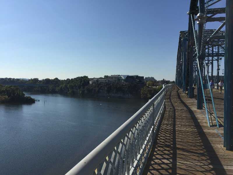 The view looking down Walnut St. Bridge looking back toward Hunter Museum of Art. I love walking on this bridge.