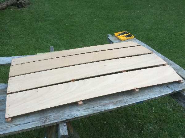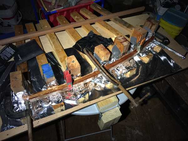 I planed lands in the arches. Then I screweed and glued on the plywood strakes. Here I set it up to drill holes for threaded rods in the 4 corners. The panel will be secured to the cabin top with wingnuts.