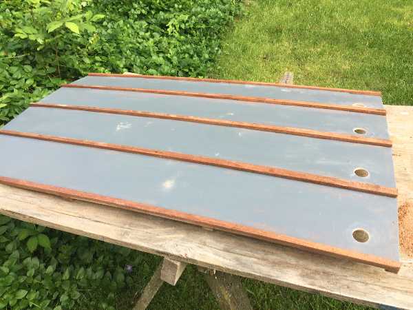 To get to this stage I cut strips of mahogany on the band saw. Then I carefully planed down some gentle tapers so that they matched the gaps between the strakes. I then glued the strips in permanently. I also test fitted some solar panel modules to make sure they slid along the whole length easily. If they did not then I sanded the mahogany.