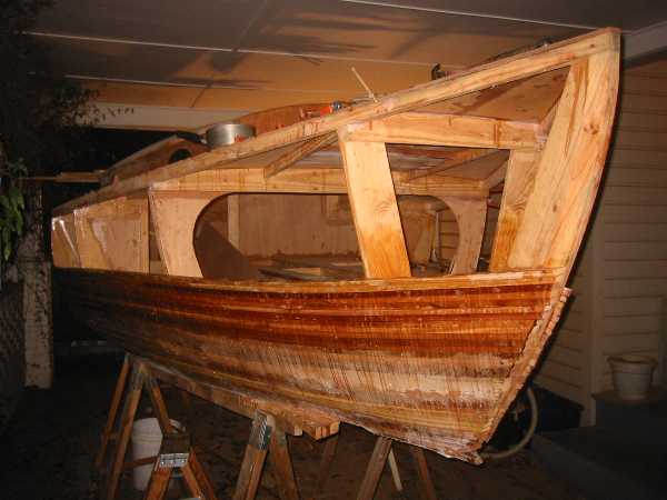 View from the bow with more strip planking in place. I cut up another batch of strips from wood I bought at the store today. I got 4 strips on the starboard side before it got dark.