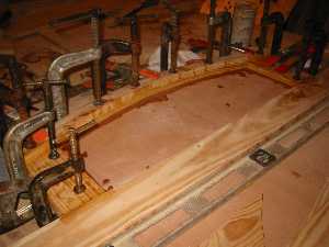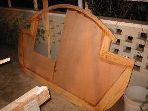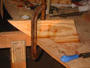 The arch for bulkhead #1 is setting up. This is a departure from the plans, which call for sawn planks to be laid against the plywood where this arch is. |