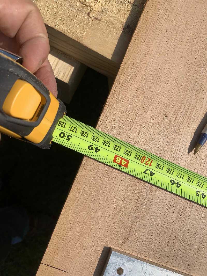 I wrote a little program to calculate the spaces for the sleepers so that only a small amount of overhang exists at plywood joints but the sleepers are evenly spaced. It definitely speeds marking the wood up when the numbers are handy for me to use.