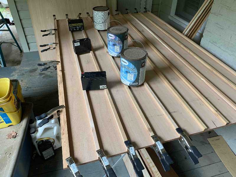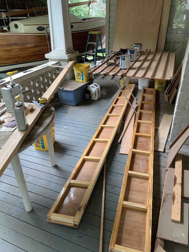 Here is a nearly finished lower side. This consists of 1/2" marine grade plywood on a framework made of 1 1/2" x 1 1/2" SYP. This is fairly durable wood that takes epoxy well and is less expensive than a lot of other woods.