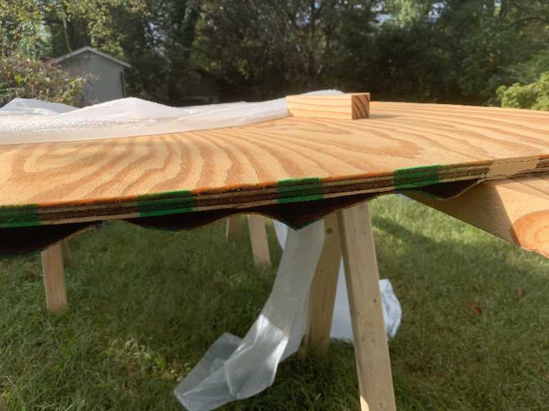 Joining two piees of plywood edge to edge with epoxy is a bit problematic because the plywood edge soaks up a lot of epoxy. I was able to line up the edges and keep them aligned due to friction between the two pieces. I then taped up the underside to keep epoxy from leaking out. Then I liberally applied epoxy to the top side so that it would drain into the slot and fill it up. This scheme mostly worked.