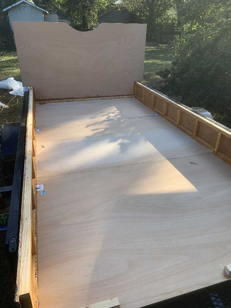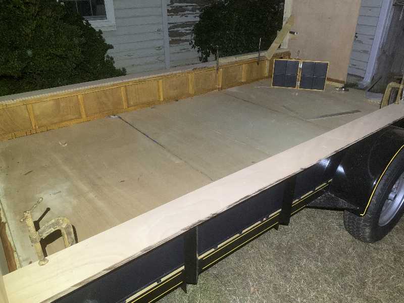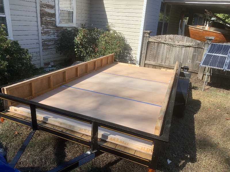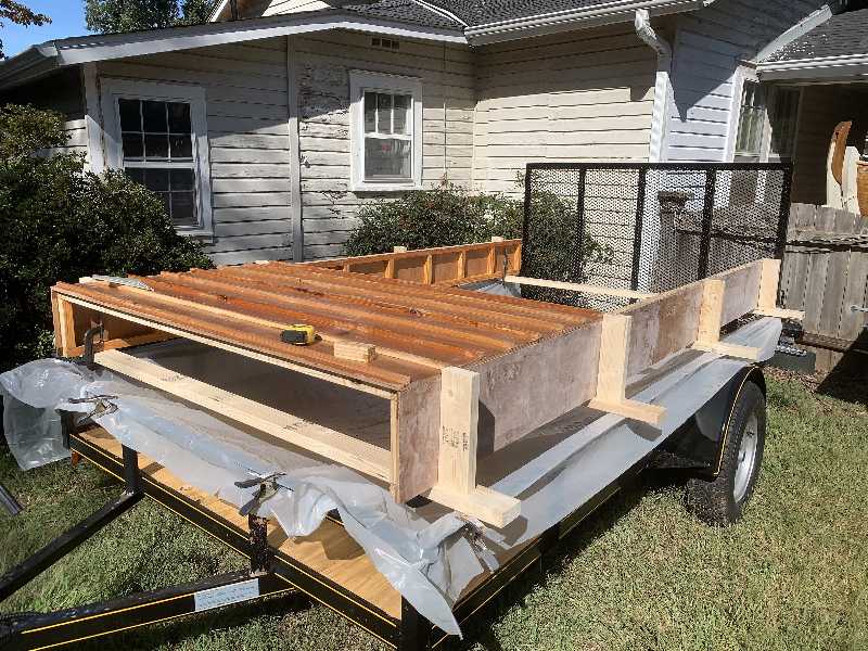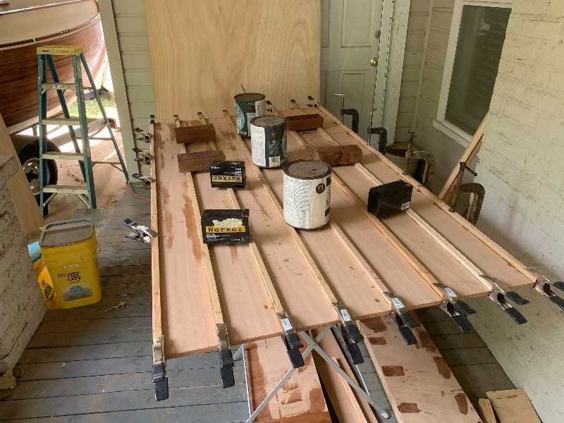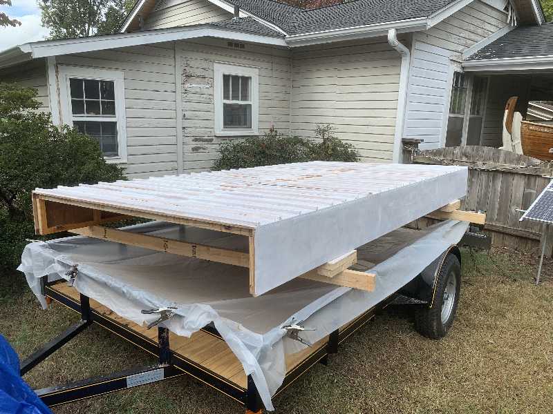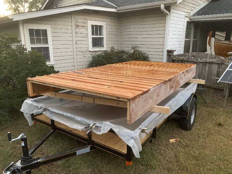 Here is a floor section assembly. There are three of these. The floor is 1/2 inch plywood resting on top of cedar strip sleepers. Everyything underneath is to be coated in epoxy. It's a given that when being towed, water will splash up from the road through the cracks in the planks. The cedar sleepers allow air to circulate and dry it out quickly. The epoxy will keep this water from soaking up through the floor.