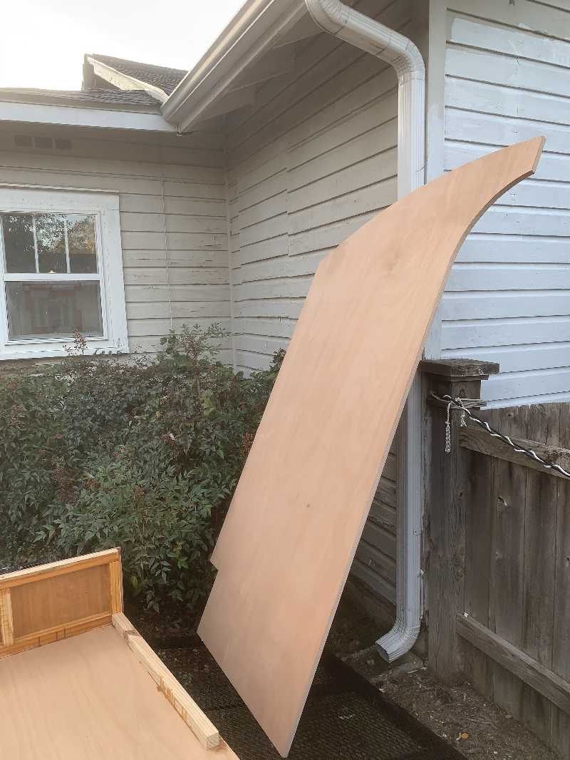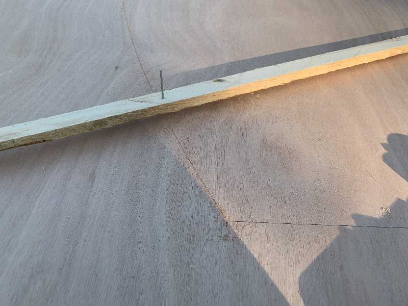 I cut the front and back out of 3/4 inch marine grade plywood. Here I am tracing the radius for the roof out. It will rise 1 foot over a chord of 7 feet.