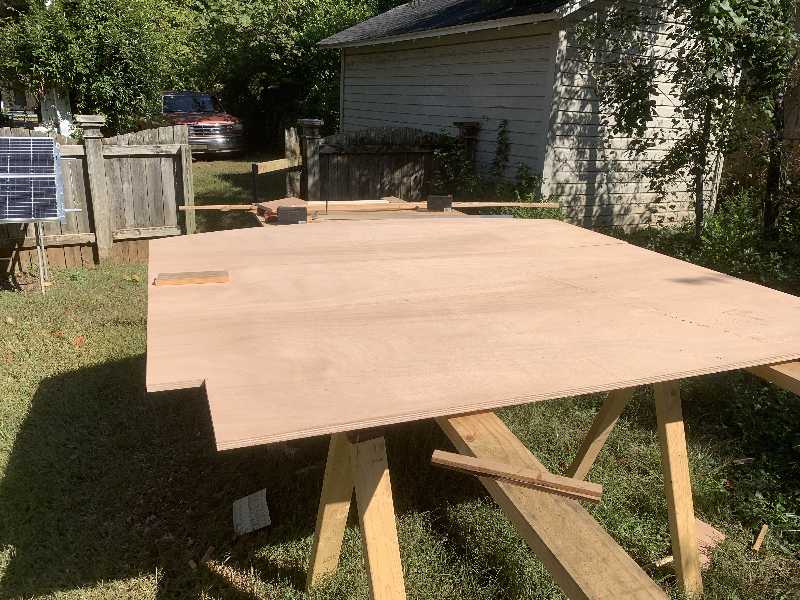 I cut the back section out of two vertical sheets of marine grade plywood. I did the back vertically so I could get the doorway out and have it still be two pieces.