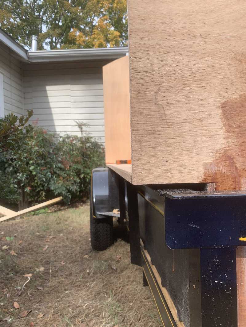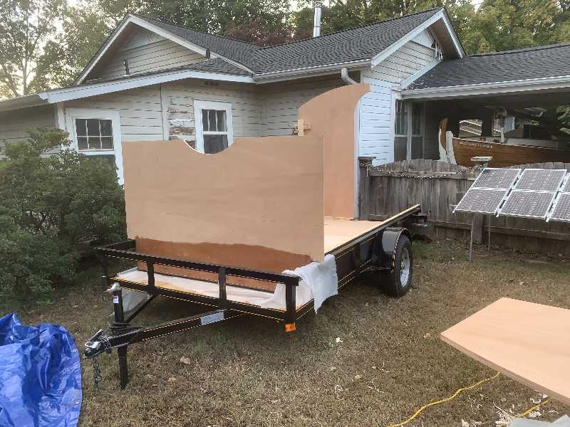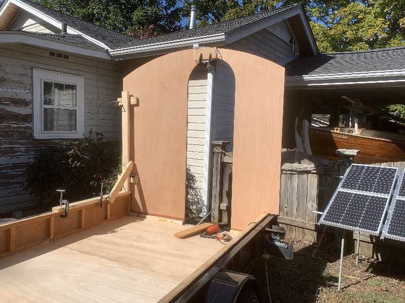 With the other half of the back attached the Gypsy wagon now has a doorway. I had to pry up the back floor to make the piece fit the way it should. This means that the bottom of the utility trailer may be uneven. I'll be investigating that and deciding how to fix it to give good support to the floor.