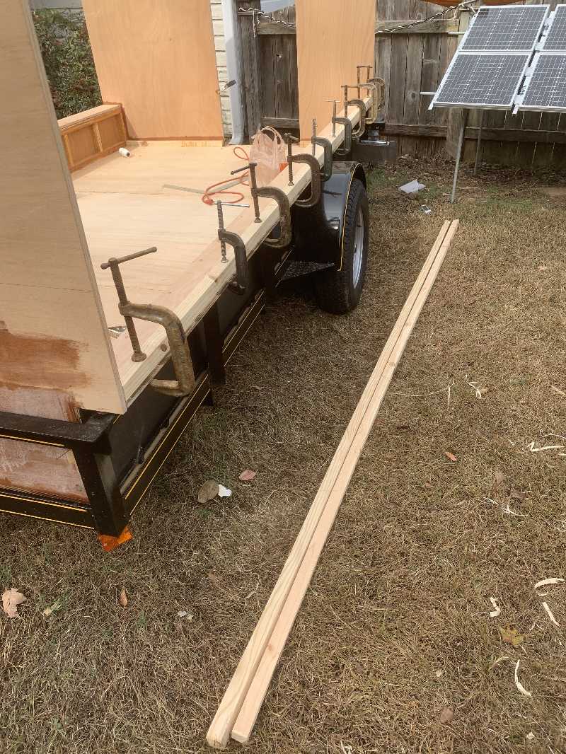 Next I started the bottom of the side wall frames. These are 1 1/2 inch square southern yellow pine. I cut these out of a 12 foot 2x10 and set them aside for a few days. Several of these developed twists up to 30 degrees over the length. Even with multiple clamps I could not persuade it to lay flat. I rejected two pieces before I found one that I could work with.