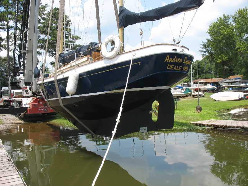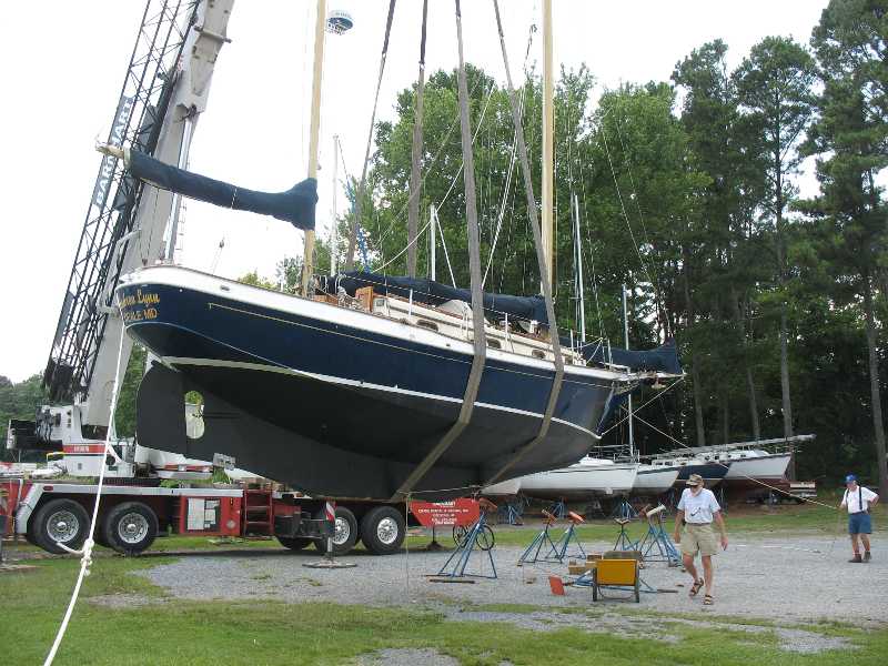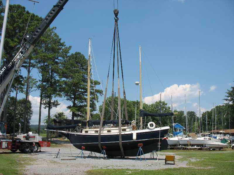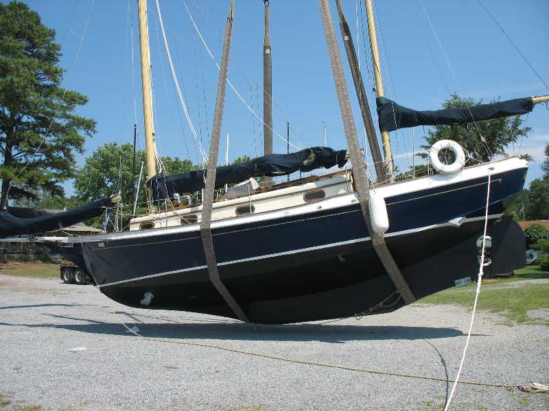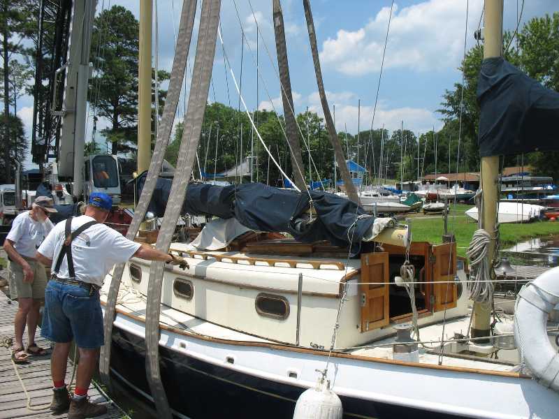 ![]() I had told the crane operator that she might weigh 14000 lbs. He planned for up to 15000. He put a strain of 15000 and she was not budging. I had suspected that she weigh more than 12000 by the way she sailed and for other reasons. |