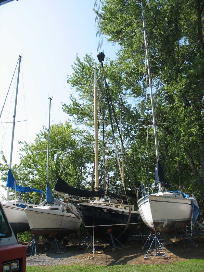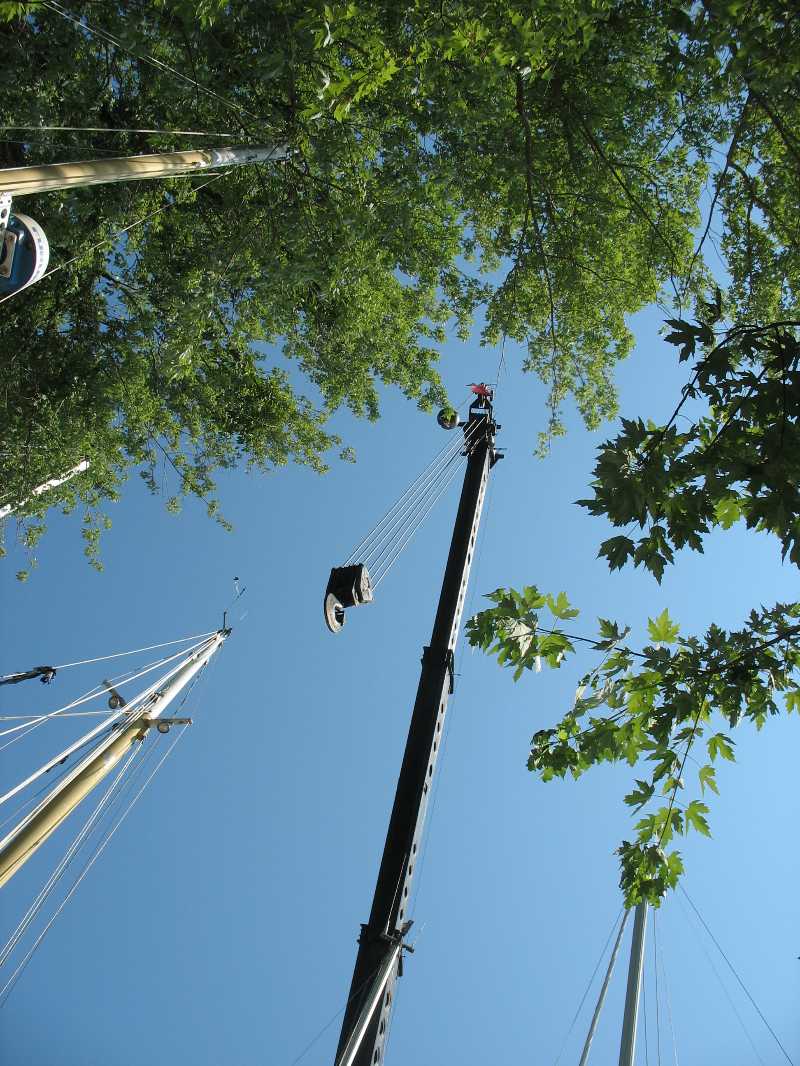 ![]() I had worried about how he was going to get at the boat to hoist without risking tearing up the rigging or damaging other boats. The solution was to raise the boom as high as possible and hoist over all the rigging. I had lost some sleep thinking about this. |