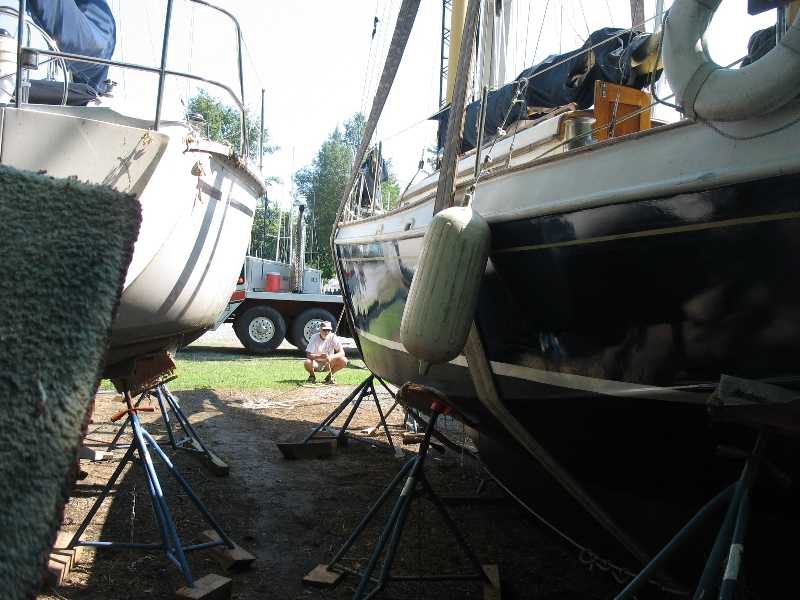 ![]() We have lift off. The scale read 16900 and was accurate to 100 lbs. He skillfully maneuvered her out of the slot. I manned the aft tag line. Ernie manned the forward. At first when she came off the jackstands she wanted to move stern toward the water. I got her under control. |