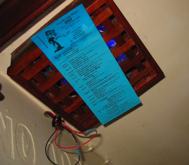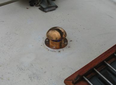 I decided I could do better. I looked around the web. I recalled seeing catalog item #HL-1570 on http://www.classicmarine.co.uk. I queried the Wooden Boat Forum for ideas. I got a good deal on this brass vent on Ebay. For the fan I looked around for 12 volt dc brushless motors with fans and then hit upon computer cabinet fans. They are small, cheap, quiet and plentiful - all very good attributes. Chuck on the Wooden Boat Forum graciously offered to send some small computer fans that he had. I give special thanks to him. Removal of the old octagonal abomination was difficult. It was glued on with 3M 5200 and 8 bronze phillips head screws. When I installed it I obviously had not planned to remove it. First I used a soldering iron to heat the screws and soften the epoxy. I cleared out the phillips slots and eased the screws out. I then pried and sawed away at the 3M 5200 with a Japanese hand saw. Finally, after about 1 ½ hours of effort it came loose. Then it was a simple matter of drilling 4 holes, gluing, and bolting in the new fixture. All that was left was to patch the old holes and paint. | ![]() |