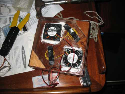 For the fans I built a small square enclosure. I used 4 pieces of 1/8 inch Sapele plywood for the outside and a 5” square of the same stuff to mount the fans. |