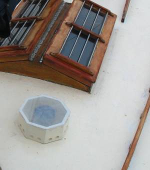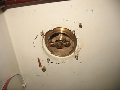 Next I turned to the inside. This brass vent has a handle that allow one to close it from the inside. Normally I would keep this open unless I was at sea and there was a lot of waves breaking over. Also I can turn it shut from the outside so I'll cover this up. | |