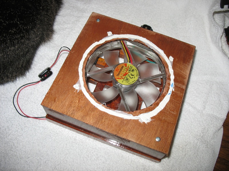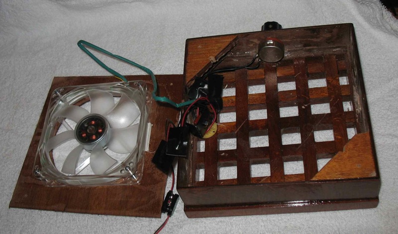 I rebuilt the assembly using a 120mm fan. Since this fan is a bit loud at full speed I wired in an adjustment knob. This adjusts an LM317T voltage regulator that controls the voltage going to the fan. At low speeds it is very quiet and uses about 100ma. At full speed it will move quite a bit of air but only use about 300ma.