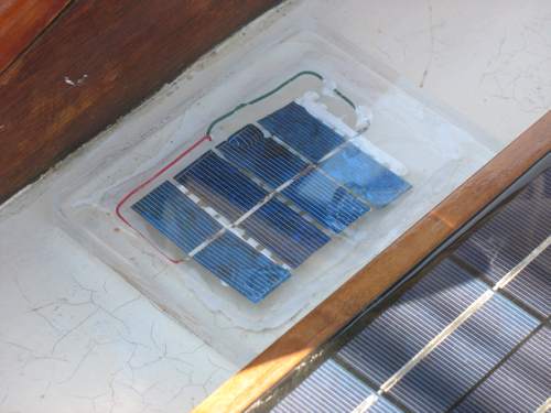 The next step was to build a small 4 cell panel to power the motor. The idea is that if the boat was bow into the slip it would use this panel to run on. But if the boat was stern first in the slip it would use its original panel to run on. Also no voltage step down was needed. I used a science kit and some plexiglass to make a panel. It ran the fan motor just fine. I placed this panel behind the butterfly hatch and wired it up. This worked ok but wouldn't win any beauty contests. | |