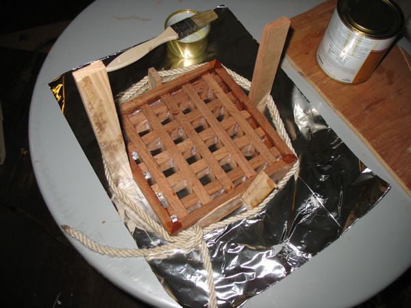 I designed the vent to look fairly traditional but accommodate the small computer fans. I used the toothed mahogany grate stock that I had left over from the earlier deck grate project. I had not cut this first stock quite perfectly so I had set it aside. With a little sand paper I was able to make it work sufficiently for this. I fitted the pieces together and glued them up. Once the glue was dry I thinned it down to about 3/8 inch with several passes through a thickness planer. I made a border the same way and glued it on. |